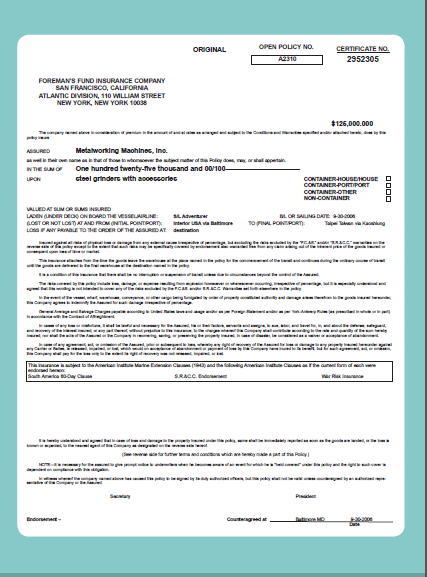 An Insurance Certificate is a document required for import customs clearance. Or the form may be printed and completed by hand. Ship and Cargo Charges.